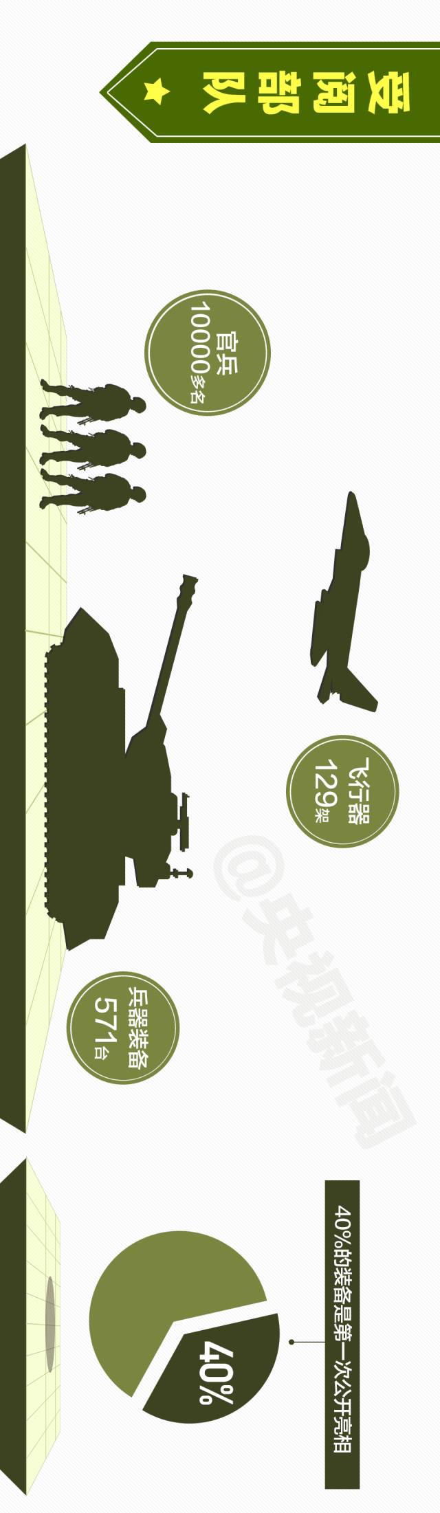 本次阅兵分列式部分九个作战群的36个方梯队参加,1万多名参阅官兵、129架飞行器和571台兵器装备,展开空地分列式,通过检阅台,其中40%的新型装备是第一次公开亮相。