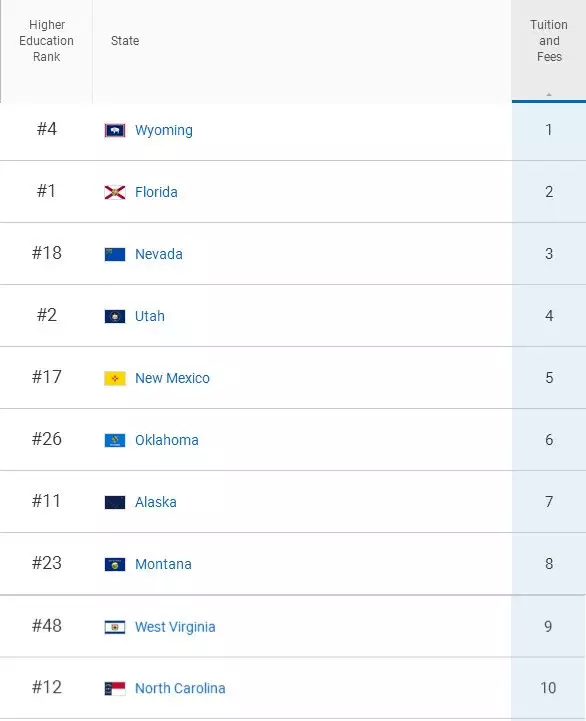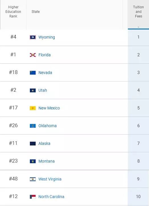 在“各州大学的平均学费水平”最低的10个州里,佛罗里达州排在全美第2: