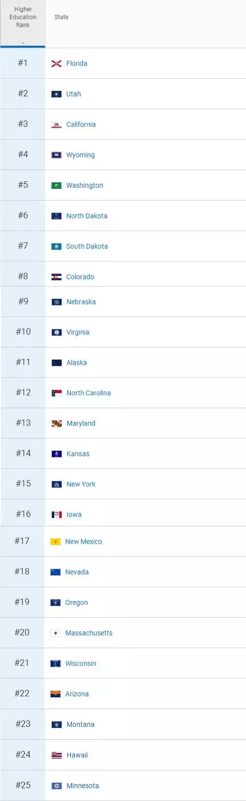 在评估的5个指标中,佛罗里达州在“受高等教育居民比例”方面,排在全美第2位:
